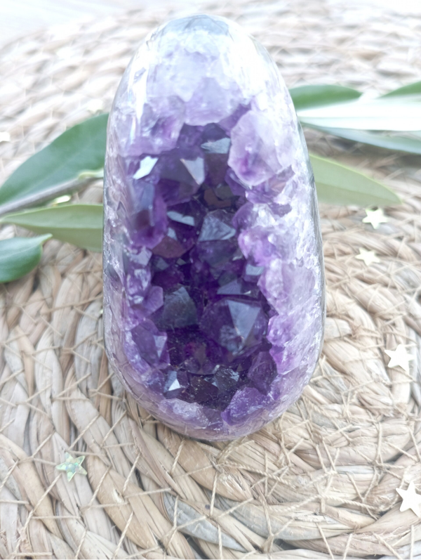 Votre géode sera accompagnée d'une fiche conseils purification et rechargement + description de ses vertues en lithothérapie.