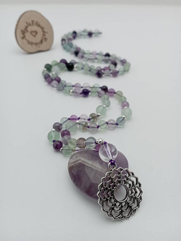 Ce collier long est aussi un Mala qui contient 108 perles (+ 1 perle guru devant et 1 perle de nouage à l’arrière).