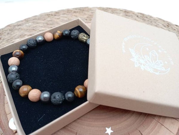 Bracelet PROTECTION et ANCRAGE. Tourmaline, œil de tigre, lave, bois et hématite. Bijou en Pierres Naturelles pour la famille