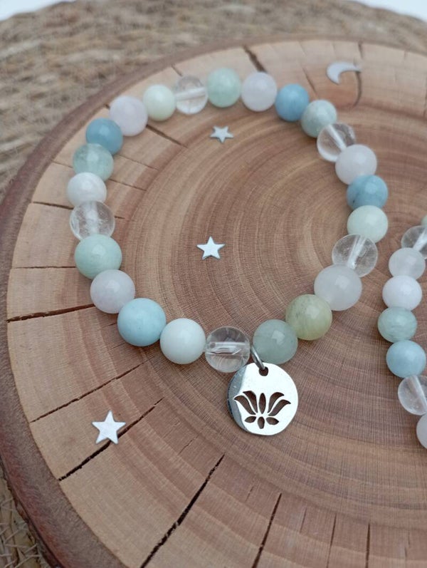 Il diffuse des vibrations de douceur, de réconfort et d’harmonie émotionnelle, tout en favorisant la sérénité intérieure.. Fait main avec breloque et intercalaires en acier inoxydable.