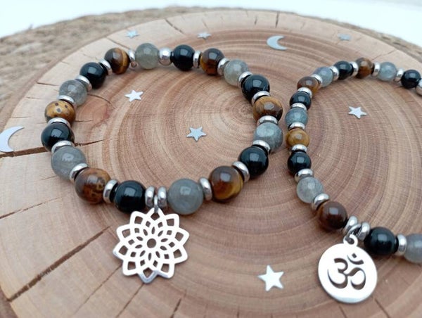 Bracelet PROTECTION ÉMOTIONNELLE. Labradorite, tourmaline et œil de tigre. Bijou en Pierres Naturelles et Acier Inoxydable